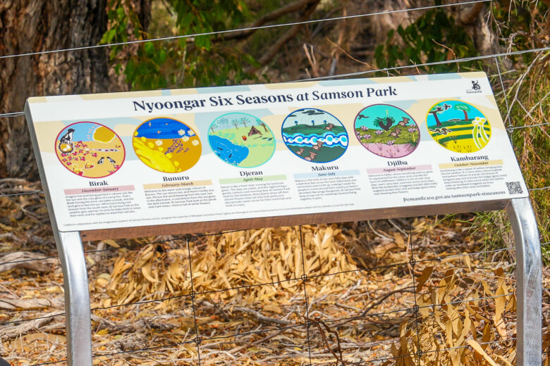 Free Address 17 Sellenger Ave, Samson WA 6163 Get directions Suitable for Community Events, Picnics Basketball courtBBQToiletsPlayground Sir Frederick Samson Memorial Reserve (Samson Park) is the most significant bush reserve in the City of Fremantle, cared for by community custodians and well-used by dog walkers, families and nature lovers. Previously the property of the Armed Forces during WWII, the bushland space that makes up the reserve was taken over by the Fremantle Council in 1971 and was officially vested in the City of Fremantle in 1985. Located in the City’s easternmost suburb of Samson, this recognised Bush Forever site has two substantial segments of remnant Jarrah, Marri and Tuart woodland that once dominated the Fremantle region. In addition to the abundance of endemic native plants, this reserve is also home to over 50 bird species, reptiles, and bats. The grassed area that dissects the park is also a popular recreation spot, featuring a fenced children’s playground, BBQ facilities, a basketball court and small toilet block. The central turf area of Sir Frederick Samson Memorial Reserve is designated as a dog off-lead exercise area. Please note the surrounding bushland areas are dogs-on-lead at all times. Important reminders: Off-lead areas are shared spaces – please be respectful of all other park users. Dogs must be under effective control at all times (able to respond to voice or hand commands). You are required to carry a lead with you, even in off-lead areas. If a dog causes nuisance, harasses others, or cannot be controlled, Rangers may issue fines. Nyoongar Six Seasons project at Samson Park KAYA! This project is a collaboration between the City of Fremantle, Whadjuk consultant Freda Ogilvie and Aboriginal consultant Marissa Verma. Together, they extended a warm invitation to the sixth grade students from Samson Primary School, inviting them to embark on a unique journey at Sir Frederick Samson Park a Bush Forever site. Freda Ogilvie’s vision was to introduce the students to the rich tapestry of Nyoongar culture, offering insights into the Six Seasons, and illuminating the profound significance of the Samson Bush Forever Reserve. During Djeran, under the open skies of Samson Park, an outdoor art class came to life. As Freda Ogilvie shared her wisdom, assisted by Narelle Ogilvie the students were captivated and inspired. Following her guidance, each student’s creativity blossomed onto paper as they depicted the essence of each of the Six Seasons. These heartwarming images have been transformed into a sign that now stands proudly in the Bush Node next to McCombe Avenue, depicting the Nyoongar Six Seasons. A visit to Samson Park becomes an adventure as visitors can decipher the signs, uncovering the rhythm of the seasons and the ever-changing landscape.